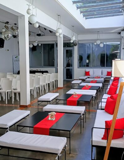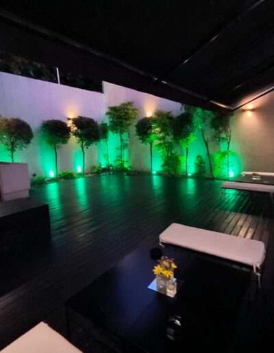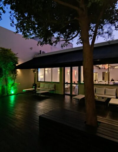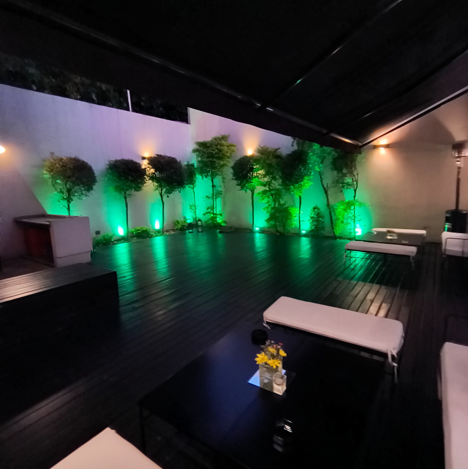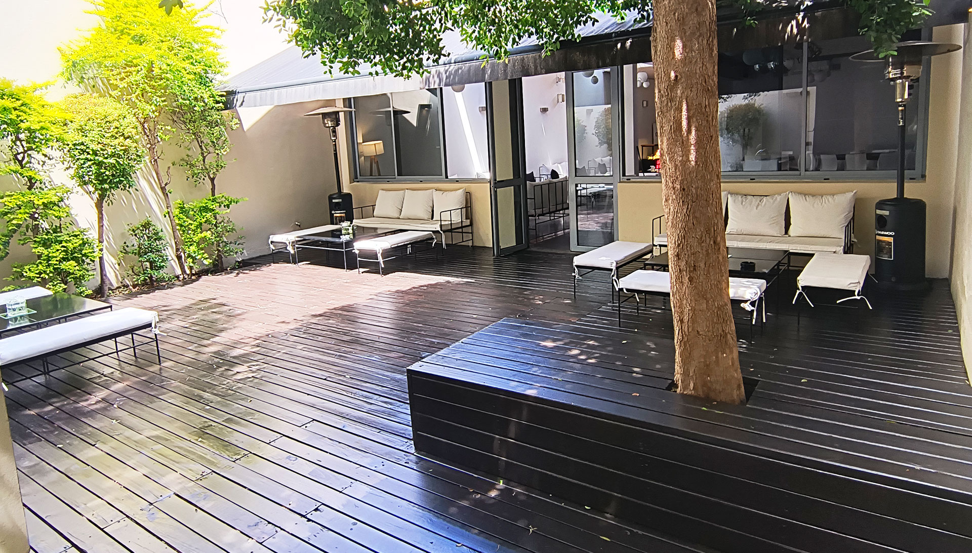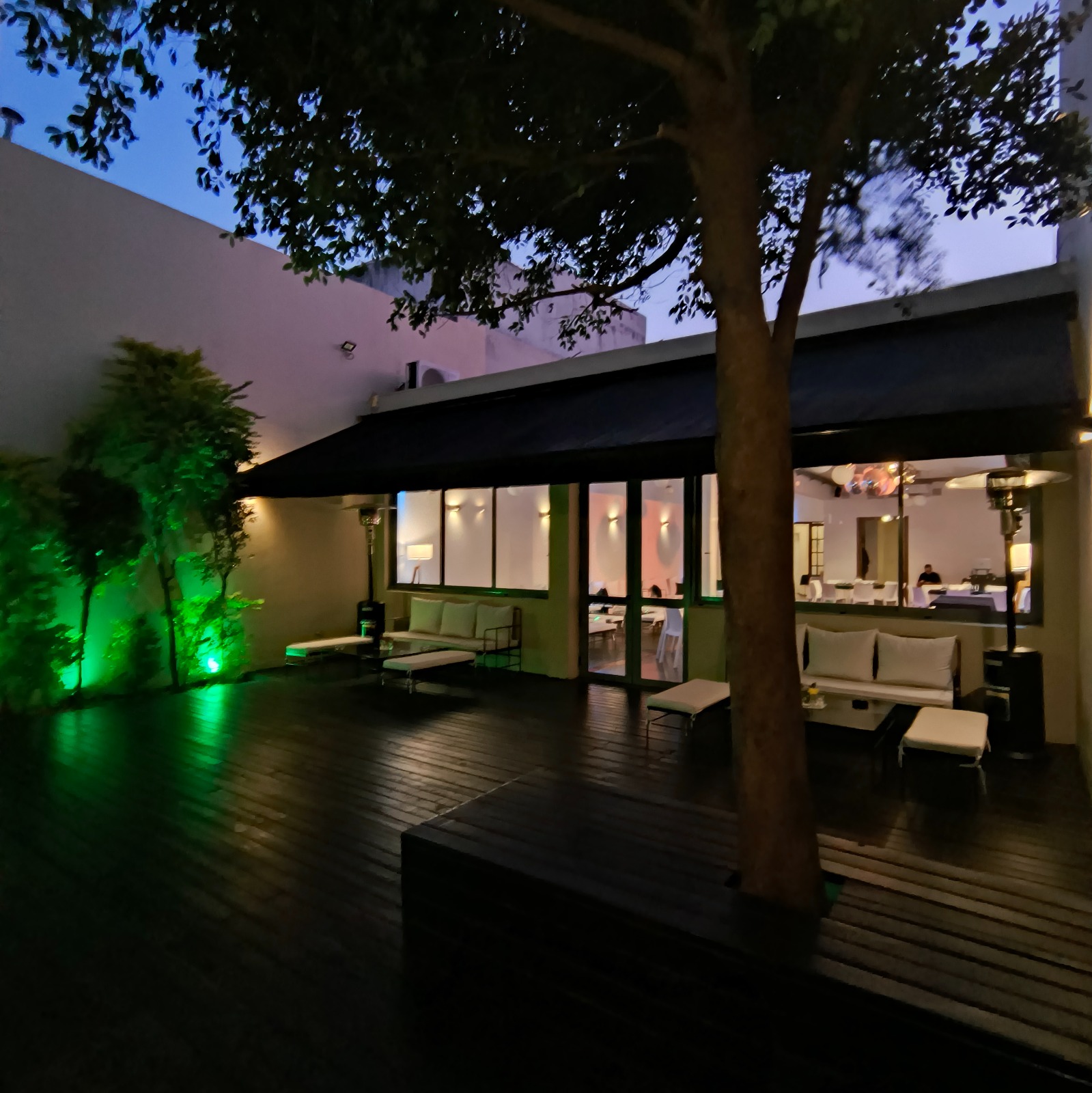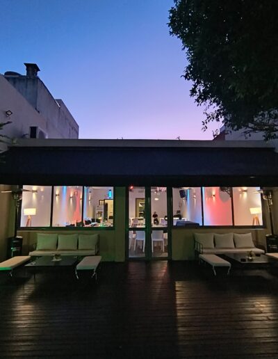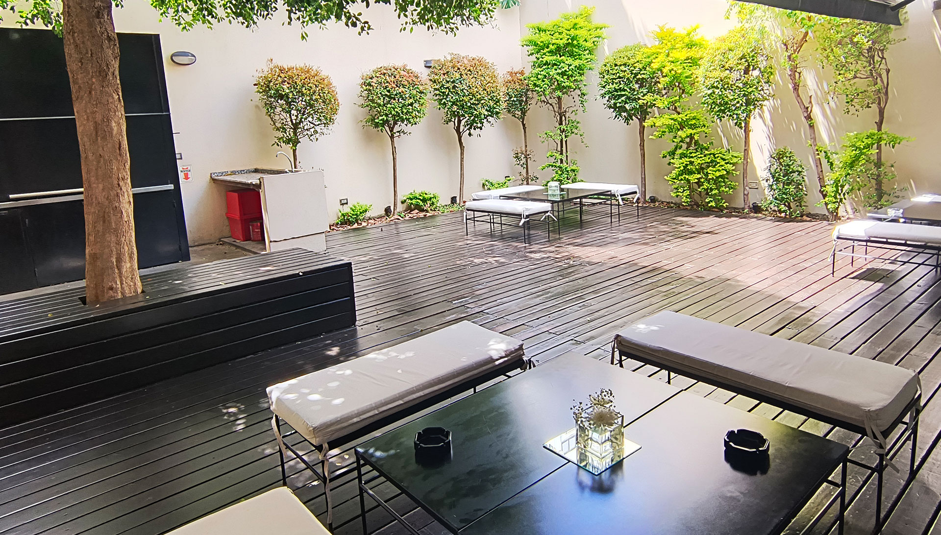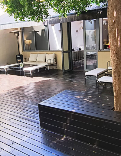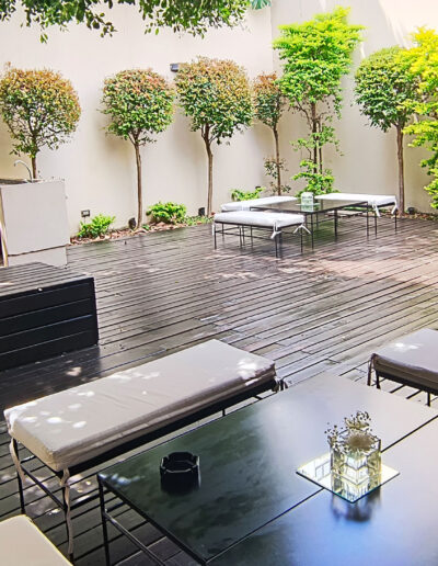 Te invitamos a disfrutar de nuestro deck y jardín, un espacio al aire libre pensado para relajarse y compartir. Rodeado de verde y equipado con climatizadores exteriores, ofrece el confort perfecto durante todo el año, ya sea para un brindis al atardecer o una noche bajo las estrellas.